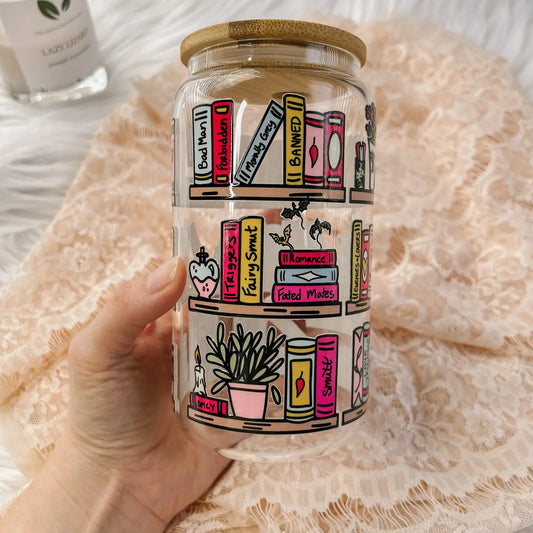 Romance Reader's Bookshelf Glass Cup w/ Straw
